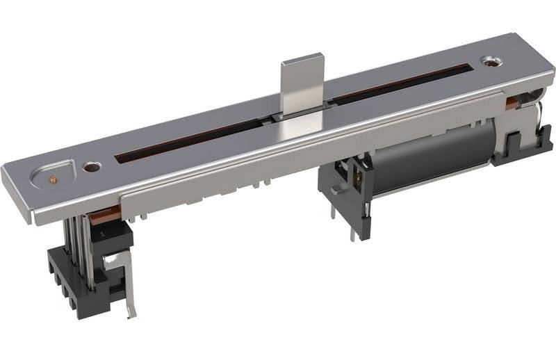 A motorized fader is a combination of a slide potentiometer, a touch sensor, and a motor. Typical slide faders are 100mm, but can be found at 60mm.