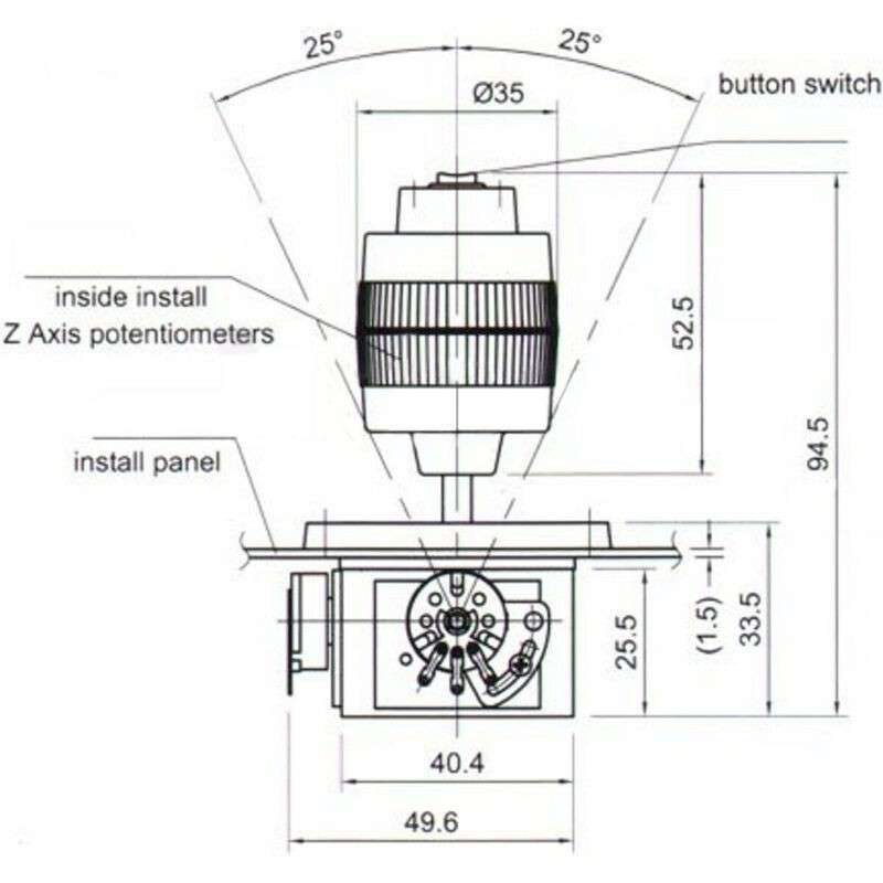 An analog joystick has one or more potentiometers, usually spring-loaded to center. Two terminals supply the voltage, and the third terminal is the “wiper” which reads the amount of voltage resulting from the variable resistance. When the stick is in the middle position, the voltage at the “wiper” is 50%, while full deflection to either side results in either 0% or 100% voltage. Swapping the polarity of the power leads reverses the resulting reading at the “wiper”.