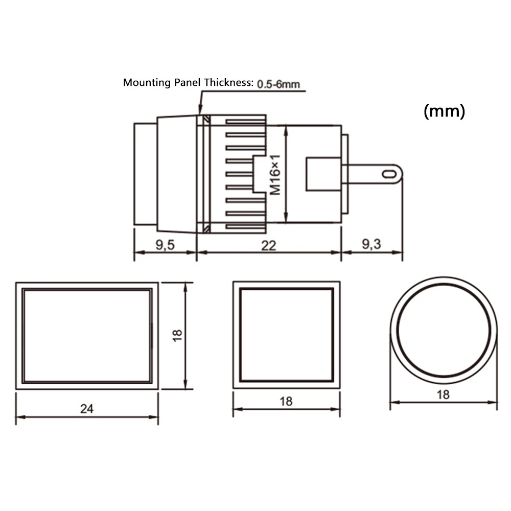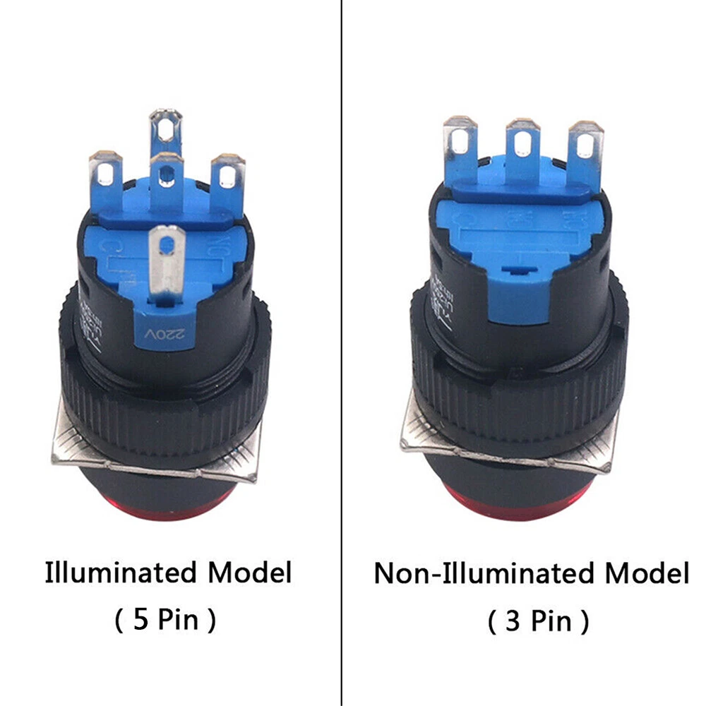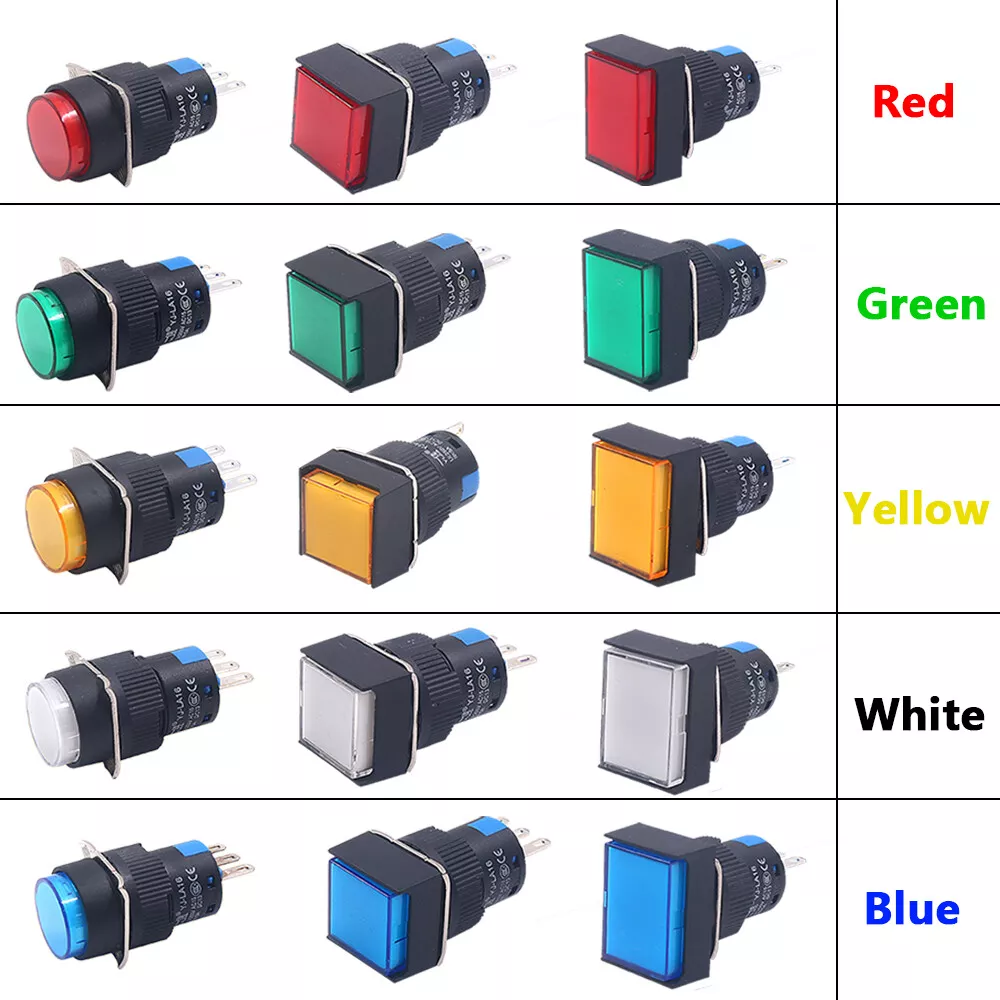 The A6 series pushbutton is an industrial device that is manufactured in several shapes, sizes, and colors. It can include an LED, with its own internal current-limiting resistor, meaning that its terminals can be connected directly to voltage. The button is labelled for a maximum voltage, with typical ratings ranging from 5V to 220V. Supplying less voltage than the maximum will produce a dimmer light.