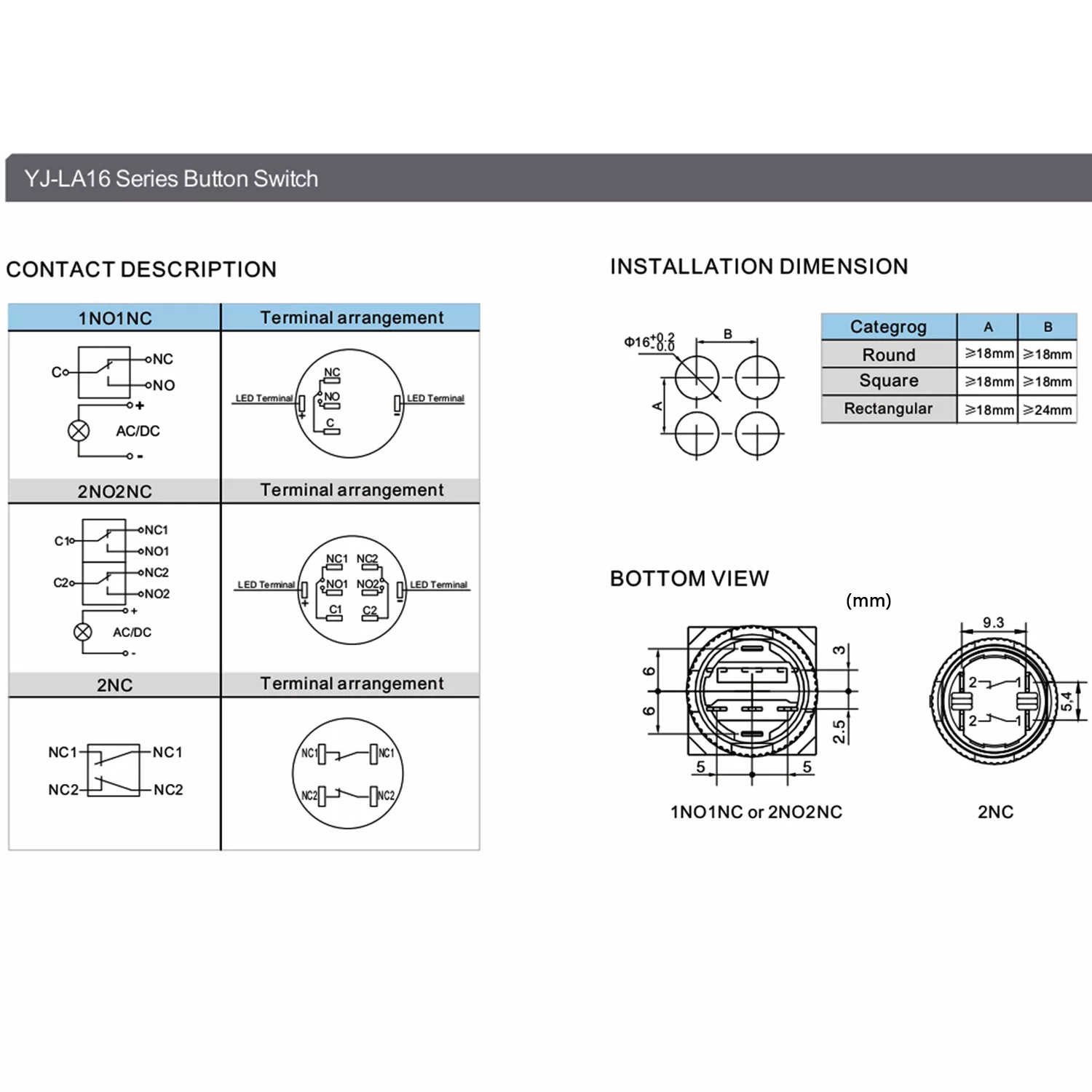 - NC = Normally Closed: the circuit is closed when the switch is not pressed.